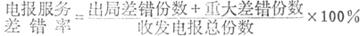 邮电(电信)局(包括分支机构)发生的出局差错份数和重大差错份数之和占本局(包括所属分支机构)收发电报总份数的百分比。计算公式为: