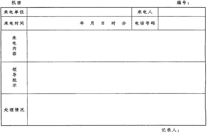 释义 | 电话记录单 【简介】: 电话记录单是党委办公部门值班室使用的一种表格式专用公文,用于记录重要电话尤其是报告重大突发性事件的电话的内容及其处理情况。 电话记录单的内容主要包括:来电单位、来电人、来电时间、来电人电话号码、来电内容、领导批示、处理情况、记录人等。 【范例】: 中共××市委办公厅 电话记录单 |