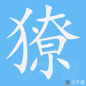 尞,既是声旁也是形旁,表示烧荒。獠,篆文=(犬)+(尞,烧荒),造字本义:在夜间的山上四周点火,放出猎犬围猎。