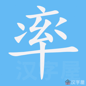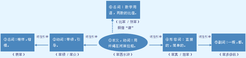 字源解说 率,甲骨文 = (水)+ (幺,丝线、绳索),像一根绳索拖在河水中。造字本义:用纤绳在河岸拉船。金文 承续甲骨文 字形。有的金文 将金文字形 中的河 改写成“行” ,强调拉船前进。篆文 在水中的纤绳 上下两端各加一个 (十,“又” 的变形,表示抓握),强调双手抓纤拉船。隶书 误将篆文 上面的“十” 写成 。 附 文言版《説文解字》:率,捕鳥畢也。象絲罔,上下其竿柄也。凡率之屬皆从率。 附 白话版《说文解字》:率,捕鸟的网。 ,像丝织的网,上部的 和下部的“ ”,是捕鸟网的竿和手柄。所有与率相关的字,都采用“率”作边旁。 引申线索