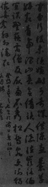 【简介】: 明·米万锺书。绫本。七律诗一首。凡五行,共七十七字。193.4×53.6cm。刊于日本《书道全集》(二十一)。