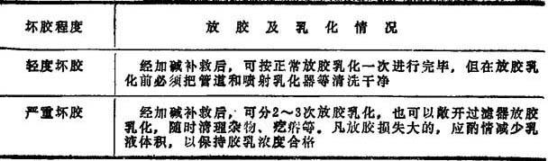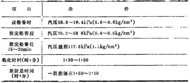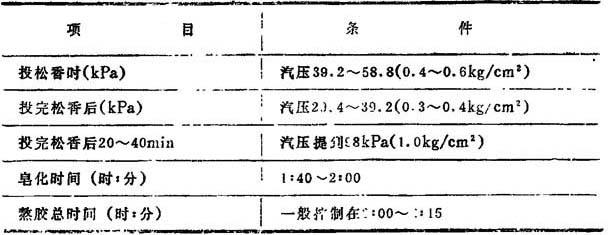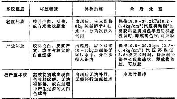 释义 | 白色松香胶的制备 白色松香胶的制备大体可分为以下几个步骤:熬制松香胶,松香胶的过滤、乳化、稀释,松香乳液的贮存等。 一种白色松香胶的制备流程如图10—2—3所示。 1—熬胶锅 2—热水槽 3—过滤器 4—喷射乳化器 5—乳化槽 6—贮存槽 1.熬胶锅(松香锅) 熬胶锅通常是由钢板制成,一般均为开口式,其加热方式等如表10—2—13所示。 表10—2—13 1—电动机 2—搅拌器 3—温度计 4—支撑脚 5—锅体 6—蒸汽夹套 7—保温层 8—放料操作机构 9—蒸汽入口 10—冷凝水出口 这种熬胶锅的特点是: ❶ 容积为1m3,锅内设有搅拌装置,由2.2kW电动机通过减速装置带动。 ❷ 锅体下半部设有夹套,供间接通汽加热用。 ❸ 在夹套外壁,引出压力管,安设压力计。 ❹ 在锅体上部设有冷却水套,供通入冷水使锅内物料获得降温,防止物料随同熬胶时产生的泡沫外溢。 ❺ 锅盖由薄铁板制成,一半固定在锅顶,另一半则可以掀开,供装料用。 ❻ 卸料口设于锅体底部,与放料阀门和放料管道相连接。 ❼ 放料管道与过滤器和喷射乳化器相连接,打开放料阀门,即可将锅内松香胶卸出,使其通过松香胶过滤器,进入喷射乳化器,得到乳化,流入乳化槽。 1m3定型设备熬胶锅的主要规格如表10—2—14所示。 表10—2—14 其他类型熬胶锅的规格尺寸如表10—2—15所示。 表10—2—15 2.熬制的工艺要求 几项熬制的工艺要求如表10—2—16所示。 表10—2—16 3.熬制要点 (1)松香和纯碱的加入顺序有三种方法,以第一种最为常用三种加入顺序如表10—2—17所示。 表10—2—17 (2)熬胶锅的搅拌装置既起保证胶料均匀的作用,又能促进反应速度。有些厂采用240r/min左右的搅拌速度,借以缩短熬制时间。有些厂则倾向于140~150r/min的搅拌速度,既能适当缩短熬胶时间,又较便于控制熬胶操作。也有的厂采用24~21r/min的搅拌速度。 (3)在熬胶开始时,不允许将松香急速全部投入锅内,以免锅内温度骤然下降,低于松香熔化温度(102~105℃),致使松香不能全部熔化,结果皂化不均匀不完全。 (4)当松香投完后就开始正常皂化,白色胶的皂化时间,一般为1∶30~2∶30左右,随设备情况、熬胶量、游离松香含量不同而有所不同。 (5)熬胶温度一般最高控制在102~105℃左右,也有控制在95~100℃之间进行的。 (6)在熬制初期,由于松香与纯碱起化学作用,产生出二氧化碳气体而发生泡沫,锅内液面急剧上升,易于造成锅内物料外溢事故。为了防止泡沫溢出和水量的大量蒸发,这时要控制升温速度不宜过快。另外,如泡沫过多有溢出锅口的趋势,应关小汽门,并利用锅体上方冷却水套进行冷却,使泡沫逐渐下降。不应该采用向锅内注入冷水的方法来减轻沸腾和减少泡沫。如果把冷水直接注入正在沸腾的胶液中,就有凝结形成大的松香块的可能,这也是以后在纸面上形成树脂斑点的原因之一。 (7)皂化过程中不得停汽过久,避免温度忽高忽低,影响皂化,影响质量。 (8)松香胶熬成后液面如有松香硬皮应该捞出。 (9)使用特级松香时,对熬胶的技术控制较困难,有时在熬制过程中就发生凝结呈凝胶状的现象,以致造成浪费。有些厂采用在加碱液沸腾后,先加入对松香重的10%石蜡作为分散剂,待石蜡分散后添加松香,再用一般方法进行熬制。实践证明,这可以防止特级松香在熬制时的凝结呈凝胶状。 (10)熬胶终点的判断:熬胶终点的判断手段如表10—2—18所示。 表10—2—11 4.白色松香胶的坏胶特征及处理 在熬胶过程中如发现坏胶,要及时处理。一般有经验的熬胶工在刚刚发现胶料发白时,立即补充加碱,把它熬成褐色胶使用,这样可以避免造成浪费。 表10——2—19列出三种坏胶情况,以及在每锅添加250kg松香熬制含35%游离松香的情况下的补救措施。 表10—2—19 坏胶的放胶及乳化情况如表10—2—20所示。 表10—2—20 以上不论轻度坏胶或严重坏胶,凡加碱补救后再经放胶乳化后的胶液,由于游离松香含量降低,碱性提高,乳液可能呈牙黄色,对施胶无太大影响,应适当加量使用。但如果乳液已失掉乳状,在使用时更应酌情加量。 5.熬制实例 采用夹套间接加热的熬胶锅,容积1.56m3,带搅拌器和冷却套。 (1)成胶特征:成胶特征要求如表10—2—21所示。 表10—2—21 (2)工艺技术条件:熬胶的工艺技术条件如表10—2—22所示。 表10—2—22 (3)操作程序 ❶ 加水前必须将熬胶锅刷洗干净,关好节门注入清水,并开汽加热。 ❷ 加碱时水温为85~90℃,溶碱时间大约为5min,加碱后略加搅拌促其溶解。 ❸ 投松香时碱液温度为100℃,并同时开动搅拌器。 ❹ 根据松香质量情况,采用分段逐步提高汽压的方法,最高汽压不超过117.6kPa(1.2kg/cm2)。 使用三级或四级普通松香熬制汽压如表10—2—23所示。 表10—2—23 使用软化点在80℃以上,颜色浅黄带浑浊的特级或一级松香,不易熬制,易于产生大颗粒。这样升温速度应该适当控制,其熬制汽压条件如表10—2—24所示。 表10—2—24 ❺ 皂化温度105℃左右,冷却水套外皮温度不高于70℃。 ❻ 熬胶过程中不得停汽过久,避免温度忽高忽低影响皂化。 ❼ 熬胶后,液面如有松香硬皮应该捞出。 (4)熬胶的生产检查如表10—2—25所示。 表10—2—25 |