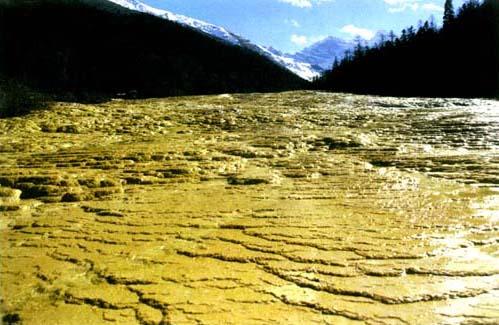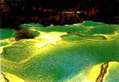 从洗身洞绝壁项至姿萝映彩池,有一段长1500米、宽20到120米的河滩(钙华流)为“金沙铺地”,因河滩沉积了大面积的钙华而如金沙闪耀,璀璨夺目。这是目前世界上发现的最长、最壮观色彩最丰富的钙华流。在沟内上段有一小型瀑布“观音洒水”尤为奇妙,当面对瀑布呼喊时,瀑布立刻化作水珠飘洒。声音停止,瀑布依旧挂落岩壁之上。 “金沙铺地”左侧是“盆景多姿”,池中或杨柳倒垂,或松柏苍古,俨然是一组大大小小的盆景展览。盆景池,由一组近百个水池组成,池中有池,池外套池。池堤随树的根茎与地势而变,堤联岸接,活水同源,顺势层叠,池底呈黄、白、褐、灰多种颜色,池面澄净无尘,望若明镜。池旁池中,到处是木石花草,翠柏盘根,由花含笑野果缤纷。这一片绚丽的景观,俨然天设地造的奇特盆景,使园艺师们也叹为观止。 这一片景观,还有紧傍森林的明镜倒影池、掩映于杜鹃花丛间的婆萝彩池和拥有彩池500多个,钙华景观中色彩最为丰富的争艳池。