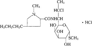 C18H33ClN2O5S·HCl=461.44 CAS-21462-39-5 甲基7-氯-6,7,8-三脱氧-6-(1-甲基-反式-4-丙基-L2-吡咯烷甲酰胺基)-1-硫代-L-苏-α-D-半乳糖-辛吡喃甙盐酸盐。 Methyl 7-chloro-6,7,8-trideoxy-6-(1-methyl-trans4-propyl-L-2-pyrrolidinecarboxamido)-1-thio-L-threo-α-D-galacto-octopyranoside,monohydrochlor-ide. 抗生素类药。用于厌氧菌、葡萄球菌、链球菌、肺炎球菌等感染。 盐酸氯洁霉素,盐酸氯林可霉素,盐酸林大霉素。 Clindamycin Hydrochloride,Cleocin Hydrochloride. 盐酸克林霉素胶囊(盐酸氯洁霉素胶囊)。 BP,USAN,USP,MI.