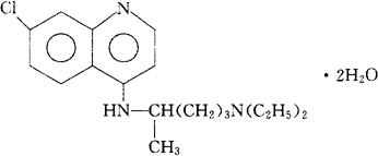 C18H26ClN3·2HCl=392.80 CAS-3545-67-3 CAS-54-05-7(chloroquine) N4-(氯-4-喹啉基)-N1,N1-二乙基-1,4-戊烷二胺二盐酸盐。 N4-(Chloro-4-quinolinyl)-N1,N1-diethyl,-1,4-pentanediamine,dihydrochloride. 7-[氯-4-[(4-二乙氨基)-1-甲基丁基]氨基]喹啉二盐酸盐。 7-[Chloro-4-[(4-diethylamino)-1-methylbutyl jamino]quinoline dihydrochloride. 抗疟药,抗阿米巴药。 盐酸氯喹啉。 Chloroquine Hydrochloride,Aralen Hydrochloride. BAN(Chloroquine),USAN,USP.  |