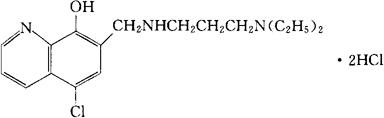 释义 | 盐酸氯胺羟喹 C17H24ClN3O·2HCl=394.77 CAS 4724-59-8 CAS-2545-39-3(clamoxyquin) 5-氯-7-[3-(二乙氨基)丙氨基]甲基-8-羟基喹啉二盐酸盐。 5-Chloro-7-[3-(diethylamino)propylamino]methyl8-quinolinol dihydrochloride. 抗阿米巴病药。 盐酸克拉莫喹。 Damoxyguin Hydrorchloride,Clamoxyl. USAN. |