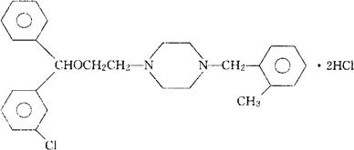 C27H31ClN2O·2HCl=507.93 CAS-5576-62-5 CAS-522-18-9(chlorbenzoxamine) 1-[2-(邻氯-α-苯基苄基氧)乙基]-4-邻-甲基苄基哌嗪二盐酸盐。 1-[2-(o-Chloro-α-phenylbenzyloxy)ethyl]-4-omethylbenzylpiperazine dihydrochloride. 抗胆碱药。 盐酸氯苯沙明。 Chlorbenzoxamine Hydrochloride,UCB 1474. INN(Chlorbenzoxamine),USAN.