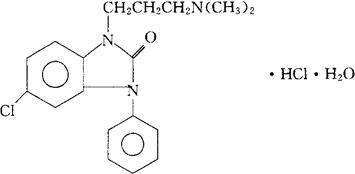 C18H20ClN3O·HCl·H2O=384.30 CAS-31959-88-3 CAS-4913-61-5 CAS-4755-59-3(clodazon) 5-氯-1-[3-(二甲氨基)丙基]-1,3二氢-3-苯基-2H-苯并咪唑-2-酮单盐酸盐一水化合物。 2H-Benzimidazol-2-one, 5-chloro-1-[3-(dimethylamino)propyl]-1,3-dihydro-3-phenyl-,monohydrochloride monohydrate. 5-氯-1-[3-(二甲氨)丙基]-3-苯基-2-苯并咪唑啉酮单盐酸盐一水化合物。 5-Chloro-1-[3-(dimethylamino)propyl]-3-phenyl-2-benzimidazolinone monohydrochloride monohydrate. 抗抑郁药。 氯苯丙间氮茚。 Clodazon Hydrochloride,HUF-2446,AW-14′2446. INN(Clodazon),USAN.  |