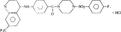 C27H22F4N4O3S·HCl=595.01 CAS-81435-67-8 1-[(4-氟苯基)磺酰]-4-[4-[[7-(三氟甲基)-4-喹啉基]氨基]苯甲酰基]哌嗪,单盐酸盐。 1-[(4-Fluorophenyl)sulfonyl]-4-[4-[[7-(trifluoromethyl)-4-quinolinyl]amino]benzoyl]piperazine,monohydrochloride. 抗高血压药。 Losulazine Hydrochloride,U-54,669F. INN(Losulazine),USAN.