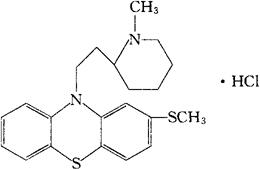 释义 | 盐酸硫利达嗪 C21H26N2S2·HCl=407.03 CAS-130-60-1 10-[2-(1-甲基-2-哌啶基)乙基]-2-(甲硫基)吩噻嗪的盐酸盐。 10-[2-(1-Methyl-2-piperidyl)ethyl]-2-(methylthio)phenothiazine monohydrochloride. 抗精神病药,安定药。用于神经衰弱、轻度精神分裂症。 Thioridazine Hydrochloride,Mellaril Hydrochloride. BP,USP,MI. |