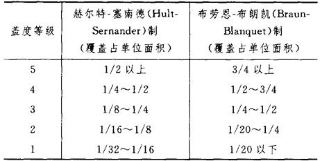 释义 | 盖度 植物群落中各种植物遮盖地面的百分率。 用以说明植物种在群落中的作用。盖度可分为投影盖度和基部盖度。投影盖度是指某一种植物枝叶在一定的土壤表面所形成的覆盖面积的比例;基部盖度是指草丛或个别植物种其基部在单位样地中覆盖面积的比例。植物种的盖度有用五级制的盖度等级表示的,常见的有两种: |