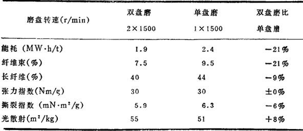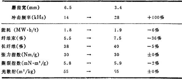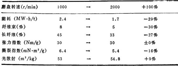 Jan Sundholm等人研究了盘磨机的转速对RMP的生产过程的影响,指出在一定游离度下,提高磨盘转速能耗下降。图7-3-70为双盘磨在不同转速下能耗与游离度的关系。图7-3-71表示这种随转速提高能耗下降的趋势对于双盘磨和单盘磨都一样。双盘磨粗齿型的能耗比细齿型略低;在同一速度下,双盘磨能耗比单盘磨低。 图7-3-72为纤维束含量和磨盘转速的关系。可以看出随著磨盘转速的提高,纤维束明显下降,双盘磨的纤维束比单盘磨少,而双盘磨中粗齿磨盘的纤维束较少。 图7-3-73表明提高磨盘转速,长纤维含量有所下降。单盘磨生产出的浆长纤维含量最高,细齿磨盘对纤维长度的影响比粗齿磨盘小。 图7-3-74可以看出,磨盘转速和磨浆方式(双盘磨或单盘磨,粗齿型或细齿型)对抗张强度无显著影响。而提高磨盘转速撕裂度下降,如图7-3-75,单盘磨生产的浆撕裂度最大,双盘磨中细齿磨盘磨出的浆撕裂度较高。 从图7-3-76可以看出,提高磨盘转速可提高浆的光散射系数,双盘磨生产出的浆的光散射系数比单盘磨的浆高3~4个单位。 根据上述结果,可以就磨盘转速对盘磨机械浆生产的影响归纳如下: ❶ 双盘磨的转速从1000r/min提高到2000r/min时磨浆能耗和纤维性质的变化如表7-3-17。可以看出电耗可降低30%,纤维束和长纤维含量都有较大下降,撕裂度有所下降。 表7-3-17 双盘磨转速由1000提高到2000r/min对浆料性质和能耗的影响  注:游离度120mL,用细齿磨盘. ❷ 单盘磨和双盘磨的磨浆效果可比较如表7-3-18。 表7-3-18 双盘磨(2×1500r/min)和单盘磨(1×1500r/min)比较  注:游离度120mL,用细齿磨盘. 在磨盘转速的绝对值相同时,单盘磨的能耗比双盘磨高,而单盘磨生产出的浆长纤维含量较高,撕裂度较大。 ❸ 表7-3-19表明将磨盘齿数增加一倍以提高冲击频率时,能耗增大,这和用提高磨盘转速来提高冲击频率的效果相反。 表7-3-19 双盘磨的磨盘齿数增加一倍时的效果(转速2×1500r/min)  |