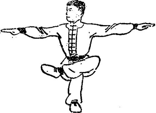 支撑腿屈膝半蹲。另一腿屈膝,踝关节盘放在支撑腿的大腿上。