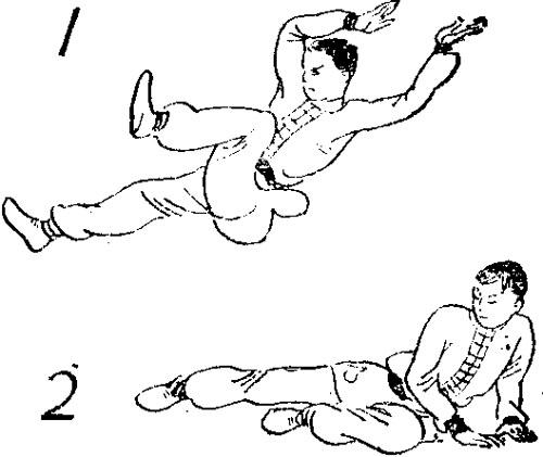 左腿屈膝向右摆起,右脚蹬地,身体悬空高于腰成侧卧、左腿屈膝盘起,落地时左腿外侧与两掌同时著地。要求腾空轻高,落地身体盘紧。