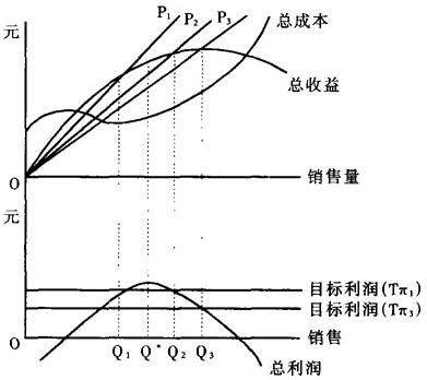 释义 | 目标利润定价 以一定最低限度利润而非最大利润为目标的定价方法。 根据美国普林斯顿大学教授鲍莫尔(W.J.Baumal)提出的最大总收益定价法,此时虽无最大利润,但包含著一个最低限度的约束利润,故也可视为最低限度的目标利润。目标利润可能是最大收益时的利润,但也可能不是。它的大小取决于在竞争中是否能满足支付股息率所需的基金,为再投资所需的基金和为保持资本市场上贷款人的信心所需的基金。 如图所示,销售量为Q*时利润最大(此时边际收益等于边际成本)。 若企业的目标利润为Tπ3,销售量就为Q3,价格线为OP3(此刻总收益最大);若企业目标利润为Tπ1,则销售量可在Q2或Q1,价格线在OP2或OP1。这里,价格线的斜率就是相应销售量水平上的产品价格。 |