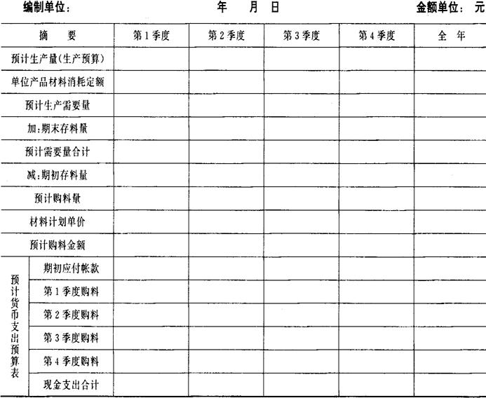 直接材料预算表的编制也和生产预算表编制一样,既要考虑生产的需要量,还要考虑期初期末的存量情况。直接材料预算表格式如下: (1)预计生产量项目可根据生产预算表中数字填列; (2)单位产品材料消耗定额:材料的消耗定额是指技术部门在一定生产技术条件下所确定的制造单位产品(或零部件)必须耗用的各种直接材料的数量,它包含切料、裁料和加工时所必须的加工余量,以及不能利用的废料等。制订用量标准时应按各种直接材料分别计算。 直接材料预算表  (3)预计生产需要量=预计生产量×单位产品材料消耗定额 (4)期末存料量:应根据产品期末存货量及单位产品存货的材料比重来确定。 (5)预计需要量合计=预计生产需要量+期末存料量 (6)期初存料量,可根据生产预算表中期初产品存货量及单位产品存货的材料比重来确定 (7)预计购料量=预计需要量合计-期初存料量 (8)材料计划单价是指采购部门按供应单位的价目表所确定的各种直接材料的单价,包括买价和运杂费。制订价格标准时应按各种直接材料分别计算。 (9)预计购料金额=预计购料量×材料计划单价 (10)期初应付帐款,可根据计划期初帐面实际数来确定。 (11)其他项目为各季因购料而预计用货币支付的金额数。 |