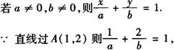 故所求直线方程为: x—3y+1=0. 例2 经过点A(1,2),并且在两个坐标轴上的截距的绝对值相等的直线方程有( ). A.1条 B.2条 C.3条 D.4条 解 设直线在x轴,y轴上的截距分别为a,b,则|a|=|b|,即a=±b. 若a=b=0,则直线方程为y=kx. ∵直线过A(1,2),∴k=2,∴直线方程为y=2x.