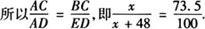 测量 例1 为测量电视塔AB的高度,小亮在他与电视塔之间竖立一根5米高的标杆(即CE),当他距标杆2米时(即点D处),塔尖A、标杆的顶端E与眼睛F恰好在一条直线上,已知小亮的眼睛距地面的高度是1.6米,标杆距电视塔的距离是108米,求电视塔的高度, 下面是小亮设计的一种方案,并根据实地测量得到的数据,给出了解答过程: 他从C点沿正西方向走到B点,使B点恰好位于A点的正南方向上,然后向南走到E点,并量得BE=40m,再从E点向东走到D点,使得点D,C,A恰在一条直线上.量得ED=100m,DC=48m,如图(2)可计算AC的长. 解 作CF⊥ED垂足是F,因为BE=40m,ED=100m,CD=48m.  BC=ED-DF≈73.5(m). 设AC=xm,则AD=(x+48)m. 因为BC∥ED,所以∠ABC=∠AED ∠ACB=∠ADE. 所以△ABC∽△AED.  解得x≈133. 答:两村庄的距离约为133m. |
