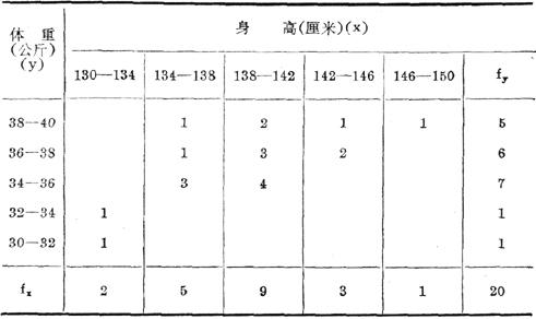 指以两个变量数列进行分组编入一个两重分类的分组次数表。 相关表的编制,一般以x为自变数,y为因变数,将x数列分成若干组,按左小右大排列于表的顶端;而将y数列分成若干组,按上大下小排列于表左侧。各组作纵横排列后,用方格分界,把每对数值分布于相应的方格内,就构成一个相关表。 设有20名男孩身高与体重的资料如下: 体重(公斤) 31 33 35 35 35 35 35 35 35 37 37 37 37 37 37 39 39 39 39 42 身高(厘米) 132 131 135 136 135 139 140 139 140 137 140 141 140 144 143 136 141 139 145 148 现将上面资料编制成如下的相关表:  编制相关表的目的是从表内各格次数排列和分布,可判断两变量间的相关程度和相关方向;可以根据表内资料计算相关系数和相关比。 |