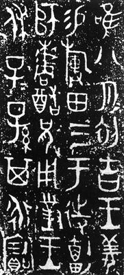 【简介】: 西周早期器铭。陕西省眉县出土。搨本。大篆。四行,行七字,共二十八字。文物出版社《商周靑铜器铭文选》(一)收入。 【赏析】: 《眉县大鼎》铭文是西周早期最爲浑厚古拙的作品。它的字形高大雄伟,有著“天姥连天向天横,势拔五岳掩赤城”的气势,使人不敢仰视。它的笔法平易拙朴,线条苍劲,变化自然;与体势配合,则有收束的作用,以避免锋芒外耀,精神洩尽。从铭文製作的基本特徵来看,它与商金文衔接,但寓意不同。这是周人在书写製作当中,加入了自己的性格和审美感觉,形成了改造式的融合。《眉县大鼎》的发现,将爲研究商周文字、书法嬗递关係提供线索。  |
