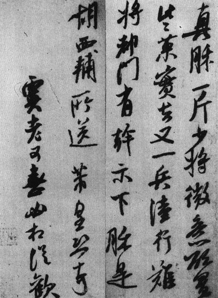 【赏析】: 米书之沉著痛快的艺术特色主要由用笔而来。侧锋取势,中锋运笔,行笔迅捷,转折遒劲,露锋尖利……,都是这种用笔的家法本色。米芾不是自称自己作书是“刷字”吗?这些方面无不是“刷”的具体体现。因而不妨说,米书的艺术风格主要是“刷”出来的。《眞 帖》的一笔一画,正是这“刷”的活灵活现。当然,也应该看到,《眞 帖》的另一突出特徵是结字的极力向右上倾斜,以致有东倒西歪之感。这自然又体现著米书在字法方面的特有属性。其所以能不拘常格、狂狷恣肆,主要当归功于这种结体。最后,与米氏其他书迹相比较,《眞 帖》显得苍健多于圆润,而结字之倾倒程度则有所收敛,也许竟是米老夫子人书俱老之后的手笔吧? 书家或以韵胜,或以势优,米书是纯以势胜者。欣赏《眞 帖》,也当于这一大方向上用心。 |