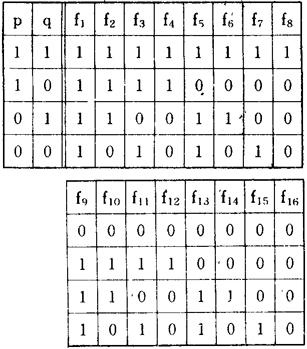 也叫”真值函数”。定义域和值域都为真值的函项。如果一个变元的任意一个允许值,另一变元总有一个确定的值与之对应,那么后者(称为应变元)就是前者(称为自变元)的函数。真值函项的个数由真值函项中所含的不同命题变元的个数来确定。n个命题变元可能有的真假情况是2n个,对于每个真假情况,又都可有两种断定:肯定和否定。这样,对于2n种情况,其肯定和否定的组合就有22n个,n个命题变元的真值函项就有22n种。如当n=1时,真假情况为21=2,真值函项数目是221=4。以”1”表示真,以”0”表示假,它们是:  当n=2时,真假情况为22=4,真值函项数目是222=16,如把fi(plq)写成fi(i=1,2,……16)时,可列表如下:  任何真值形式都表示一个真值函项,真值形式是真值函项的表现形式。如当n=1,pv p是f1(p)的表现,pvp是f2(p)的表现, p是f3(p)的表现,p p是f4(p)的表现。一个真值函项可以由多个真值形式表示,如当n=2时,(p→q)与( pvq)都表示f5。 |
