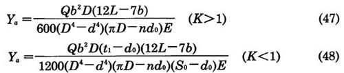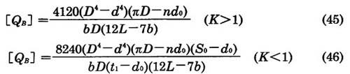 释义 | 真空伏辊 以普遍使用的真空箱式筒体材料为铸造锡青铜的真空伏辊作计算依据。 1.真空伏辊承受的实际总载荷Q (1)无吸移装置(图11-9-6) 有真空吸移装置时,由于铜网在伏辊上的包角θ<90°(通常在45°~60°之间),比无真空吸移装置的包角小得多(通常在160°~175°之间),故其合力Z的方向并不接近水平。但仍可忽视诸力N、Pk、P0等与垂直方向的偏差,将它们视为与伏辊垂直中心线重合。 式中 S0——钻孔中心对角线孔距,cm d0——不计扩孔的孔径,cm t1——沿径向的孔距,cm n——径向断面孔数 3.按辊筒刚度验算真空伏辊能承受的许用总载荷[QB] 推导此二式时,假设真空伏辊的 4.求真空伏辊工作部分的实际最大挠度Ya(cm) 真空伏辊和真空压榨辊的轴头结构多样而复杂,按轴颈应力求[QC]时不能用统一的算式。 |