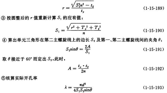 释义 | 真空伏辊辊面排孔的计算 【说明】 真空伏辊的辊面排孔多用双螺旋线排孔形式,以减少噪音和真空箱封条的磨损。在双螺旋线排孔形式中,推荐采用等边单元三角形排孔,否则,应采取边长接近于等边单元三角形边长的等腰或等边三角形。 排孔中孔位确定的规律是:把单元矩形的互相垂直的长短两边ty与tx均按单元矩形内应有的孔数n来等分并从各等分点上引出平行于边的分格线,则在沿长边的方向上矩形内每条分格线上都有一个孔的中心,对于沿短边方向上也一样。在这种分格线网的交点上直接定出单元矩形内所有各孔的中心位置。这种方法也有利于在加工中的划线及在机床上的定位。 1.等边单元三角形的边长计算 【公式】 【公式】 式中符号含义同上 4.单元矩形面积中所包含的孔数 【公式】 n=2(m2-m+1) (1-15-186) 式中 n——孔数(个) 其它同上 【讨论】 当(m2-m+1)之值可被3整除时,则这个单元矩形的长边tx就可以被均分为3段,使原来的单元矩形变成为3个新的小的单元矩形,其长边即原来单元矩形的短边ty= 5.对单位矩形内分格线网上定孔的中心的计算 【说明】 对上述单元矩形内分格线网上定孔的中心时可按以下方法进行:以单元矩形沿y轴边上的顶点A为起点,沿两条边把分格线网的分格线依次编号1、2、3……n(如图1-15-22),则在沿x轴方向上的第一条分格线上(即平行于y轴的第一条分格线)的孔1的中心按双螺旋线排孔的原理必然位于通过A点的第一主螺旋线上且距x轴r个格子之处,而:r=2m-1 在第二条分格线上的孔2的中心,将在y轴方向上距孔1中心r个格子,依次类推。在第m条分格线上的孔m的中心因为其中心距单元矩形的下边的格数已不到r个(只剩下了m+1个格子)而要数到底边后再自x轴连续地数到第r格。等边单元三角形双螺旋线排孔的数据见表1-15-19。 表1-15-19 等边单元三角形双螺旋线排孔的数据 注*为(m2-m+1)可被3整除的情况,即m=3k+2(K为正整数) 【讨论】 由上可知,ty必须能等分辊筒的圆周πD,而且同时tx必须能等分钻头间距固定不变的多钻头机床的钻头间距T。如果用表1-15-19中的相应数据不能同时满足这两个条件,就不能采用等边单元三角形的排孔形式,可按下列步骤进行排孔计算: ❶ 按已知的孔径d及要求的开孔率λ求得单元三角形的面积A 由此可按已得到的合适的ty及tx用下式来求出在单元矩形中的孔数n,必要时应略为修整λ值以保证n为正整数: ❷ 按所选定的d与λ值算出等边单元三角形边长S,暂时令其等于在第一主螺旋线上的单元三角形边长S1,即S1=So再按ty和tx绘出的单元矩形中按n画出等分边长的分格线网。在这个分格线网上用前述规律定出各孔的中心,其r值按下式计算并圆整成整数: ❻ 设计专用的多钻头机床时,应考虑所适应的真空辊(伏辊及压辊)辊径系列,使钻头间距T能在大多数情况下符合等边单元三角形双螺旋线排孔形式的要求。 |