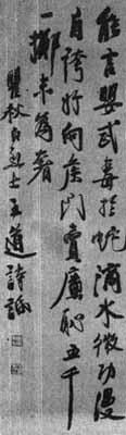 【简介】: 现代·陆维钊书。纸本。行书。四行,共三十七字。刊于《中国书法》一九八七年第三期。 【赏析】: 陆维钊长于文学、书法。对史、地、医均精有研究,曾两次受命承敎书艺而誉满书坛。其书以碑爲宗,早在垂髫之年即在潘锦甫指导下临习颜字《多宝塔》,继学魏碑墓誌,尤喜二爨、《石门铭》,晚年溶篆隷于一炉,创新立帜,格高一筹,谓之“蜾扁”而蜚声艺林。 他的书法兼善诸体,博採衆长,集碑帖之长,和于笔端,故有碑刻之骨,又含帖学之气。只是此作有几字几划欠当,如“门”字锋芒过露,又有对称之嫌;“烈”字笔连过实。然而通观其势,虽出险境,却能化险爲夷,造险也许并非本意,化险自有字外之功,而“脱巾独步,得心应手”。其中“侯”、“广”之撇如刀,“掷”、“千”直竪劲似长枪,联想起此诗之铿锵有声,自当箭拔弩张,使人有嫉恶如仇之感,难得书家之博大胸襟,能与英烈之正气相通。