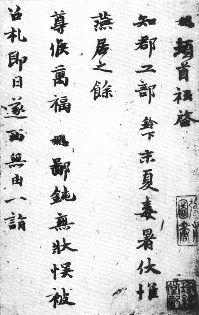 【简介】: 宋·钱勰书。纸本。行楷书。尺牍一则。凡十行,每行字数不一,共七十八字。28×356cm。台北故宫博物院藏。《墨缘滙观》、《石渠宝笈三编》著录。刊于台湾《故宫历代法书全集》。载入《故宫书画录》卷三。 【赏析】: 古人说钱勰工于正书,师法欧阳询。从这个尺牍看,钱勰的正书确实不错,笔法遒逸秀润,结体端庄閑雅,虽偏扁阔却仍瘦劲老健,秀中带刚,又淸新自然,很有书卷气,也属于文人书法中之上品。不过钱勰书虽说师法欧阳率更,但并不如欧书之劲峭险厉,倒是更有魏晋人笔意,尤近似二王。其横画转捩处,令人想起兰亭,而捺笔波磔又极沂锺繇及《玉版十三行》。说他接近晋人风度,更觉合乎情理些。其出锋内擫,又几近于王大令(献之),如观其草书,则这种感觉更明显。   作爲文人书法,大多雅秀有余而豪放不足。钱勰不失爲一位大学问家、诗人,故书如其人,下笔不俗。但比之于魏晋人之高古苍疏和盛唐人之雄浑厚重,则显得不够潇洒放逸,缺少伟男壮夫的粗豪旷达之势。当然,我们观古人作品,不必都作一种设想。在有宋一代,钱书还是有相当成就的。 |