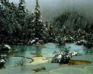 后寺之背是黄龙沟最高的池群“石塔镇海”。有彩池400余个,石坝造型优美,色彩协调,坝坎呈弧形、双扇形、裙边形,层层交叠,线条流畅。彩池池底、池壁、池堤的颜色各异,呈乳白、银灰、浅黄、金黄、绛紫、深蓝、天蓝等不同色彩。池水随池底,池边的色彩和水的深浅、水底沉积物的不同而色彩各异,斑斓夺目,动人心魄。被喻为“人间瑶池”,是黄龙景观中最美、最有特色的景点。水中石塔和石屋建于明代,经历多年,大部分被钙华沉淀埋没。