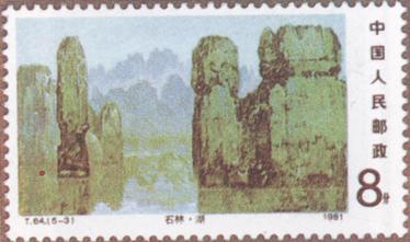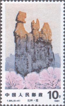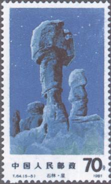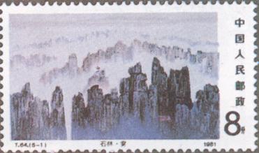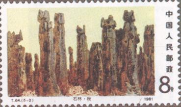 释义 | 石林 发行日期:1981年9月18日 齿孔度数: 印刷版别:影写版 票幅:(1)(2)(3)52×31;(4)(5)31×52 全张枚数:(1)(2)(3)40(4×10);(4)(5)40(10×4) 原画作者:詹建俊 设计者:任宇 印刷:北京邮票厂 (1)8分 雾中石林 1034.66万枚 (2)8分 石林之秋 898.66万枚 (3)8分 湖在石林中 114.66万枚 (4)10分 石林朝霞 508.66万枚 (5)70分 石林星空 158.36万枚 (1)-(5) 5枚全 |