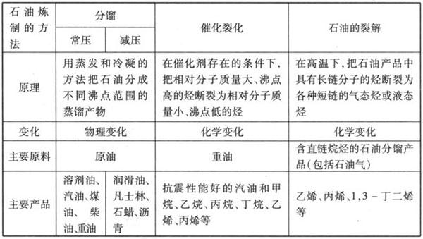 1.石油的分馏:石油是混合物,没有固定的沸点,不断地给石油加热和冷凝,就可以把石油分成不同沸点范围的蒸馏产物.这种方法就是石油的分馏.分馏出的各种成分叫做馏分. 2.裂化:在一定条件下,将相对分子质量较大、沸点较高的烃断裂为相对分子质量较小、沸点低的烃的过程. 裂化分为热裂化和催化裂化.裂化的目的是为了提高轻质液体燃料(汽油、煤油、柴油等)的产量,特别是提高汽油的产量催化裂化还可以提高汽油的质量. 3.裂解:在石油化工生产过程中,以比裂化更高的温度,使石油分馏产物(包括石油气)中的长链烃断裂成短链不饱和烃的加工过程.裂解就是深度裂化,目的是为了获得短链不饱和烃,如:乙烯、丙烯、丁二烯等所以,乙烯的产量是衡量石化工业发展水平的标志. 4.石油的炼制方法及主要产品  注 分馏中的减压分馏是利用了外界压强越大,物质的沸点越高的原理,降低了分馏塔里的压强,使重油在温度不很高的条件下就可以充分分馏,从而防止了重油在高温下炭化结焦. 5.实验室蒸馏石油的实验中的几个注意事项: ❶ 加入原油的量应占蒸馏烧瓶容积的1/3~2/3; ❷ 蒸馏烧瓶中应加入几片碎瓷片,防液体暴沸; ❸ 温度计水银球应置于蒸馏瓶的支管口处; ❹ 冷凝管中的冷却水应从下口进,上口出; ❺ 加热温度不能超过原油中沸点最高烃的沸点; ❻ 由于明火加热,特别注意安全,接受器瓶口应用一团棉花松松地塞住,接受器跟酒精灯之间应用隔板隔开. |
