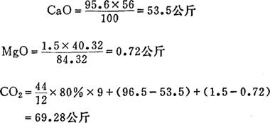 1.石灰石煅烧的主要化学反应  2.耗用燃料量和CaO及CO2的产量 若石灰石含:CaCO3……………95.6% MgCO3……………1.5% 燃料含: C……………80% 热值……………7000千卡/公斤 理论上,煅烧100公斤石灰石耗燃料量:  事实上由于热损失等原因耗燃料约8~10公斤 煅烧100公斤石灰石得:  (CO2分别来自燃料CaCO3及MgCO3) 3.所需空气量 1公斤燃料燃烧所需空气量(过量空气系数取1.2):  (23%为空气中含氧量,12及32分别为C及O2的分子量)。 9公斤燃料燃烧共需空气量: 11.12×9=100.08公斤 其中:O2:100.08×23%=23.02公斤 N2:100.08×23.02=77.06公斤 4.窑气量及窑气组成(每100公斤石灰石煅烧后所得)  在标准状况下这些气体的体积为:  (1.977;1.251及1.429为CO2、N2及O2的密度公斤/米3) 窑气组成: CO2的体积含量:  O2的体积含量:  N2的体积含量:  |
