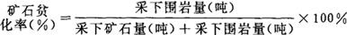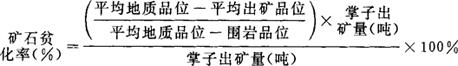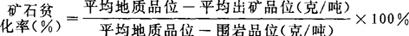 释义 | 矿石贫化率 指铁矿矿山开采过程中由于废石的混入,致使采出矿石品位降低,其降低程度以百分比表示,即为贫化率。其计算公式如下: 有色金属矿开采的砂石贫化率与以上不同。铜矿、铅锌矿、锡矿、铝矿等矿的矿石贫化率计算公式如下: 金矿的矿石贫化率计算公式如下: |