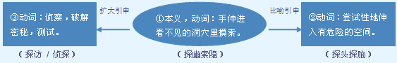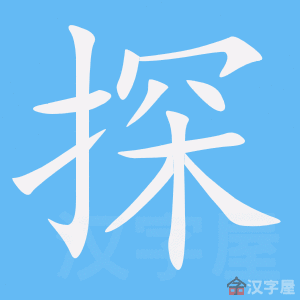 释义 | ![]() ❶试图发现(隐藏的事物或情况)。多用于口语,能重叠。 a.常作带宾、带补谓语。 地质队在这里~过矿|你去~~他的口气|白跑了一天,什么消息也没有~出来|小分队在这里~出了一种新矿藏。 ❷向前、向里或向外伸出(头或上体)。多用于口语,能重叠。常作带宾、带补谓语。 请不要向外~脑袋|他把身子~了过来|那小孩~了大半截身子在窗外,十分危险|门里~出个光光的头来|你的身子再往前~~。 【近】 ❶找 寻 ❷伸 【反】 ❷缩 【词语】 探测 探访 探究 探囊取物 探亲 探求 探视 探讨 探问 探险 探询 字源解说 罙,既是声旁也是形旁,是“探”的本字。罙,金文 ![]() ![]() ![]() ![]() ![]() ![]() ![]() ![]() ![]() ![]() ![]() ![]() ![]() ![]() ![]() ![]() ![]() ![]() ![]() ![]() ![]() ![]() 附 文言版《説文解字》:探,遠取之也。从手,罙聲。 附 白话版《说文解字》:探,伸长手臂够取较远的东西。字形采用“手”作边旁,采用“罙”作声旁。 引申线索 ![]() 【字族索引】 罙 【同音字】 tàn |