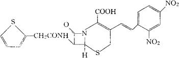 C21H16N4O8S2=516.50 CAS-41906-86-9 (7R)-3-[(E)-2,4-二硝基苯乙烯基]-7-(2-噻吩乙酰胺基)-3-头孢-4-羧酸。 (7R)3-[(E)-2,4-Dinitrostyryl]-7-(2-thienylacetamido)-3-cephem-4-carboxylic acid. 3-[2-(2,4-二硝基苯基)乙烯基]-8-氧代-7β-[(2-噻吩乙酰)氨基]-5-硫代-1-氮杂双环[4.2.0]辛-2-烯-2-羧酸。 3-[2-(2.4-Dinitrophenyl)ethenyl]-8-oxo-7β-[(2-thienylacetyl)amino]-5-thia-1-azabicycli[4.2.0]oct-2-ene2-carboxylic acid. 诊断用药。 为β-乳胺酶检查试剂。 头孢尼特罗,硝噻吩头孢菌素。 Nitrocefin,Cephalosporin 87-312. BAN,USAN.  |