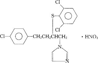 C19H17Cl3N2S·HNO3=474.79 CAS-64872-77-1 CAS-64872-76-0(butoconazole) (±)-1-[4-(对-氯苯基)-2-[(2,6-二氯苯基)硫]丁基]-咪唑单硝酸盐。 (±)-1-[4-(p-Chlorophenyl)-2-[(2,6-dichlorophenyl)thio]butyl]-imidazole mononitrate. 抗真菌药。 硝酸氯苯硫丁唑。 Butoconazole Nitrate,RS-35887,RS-35887-00-10-3 Femstat. 乳膏剂。 INN(Butoconazole),USAN.  |