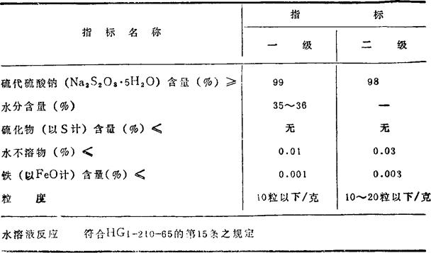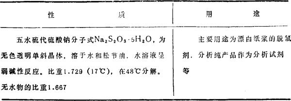 表1-14 硫代硫酸钠质量标准(HG1-210-79) 本产品是由亚硫酸钠、硫化钠制得的硫代硫酸钠,以及由染料厂、化工厂、焦化厂等下脚料综合利用所得粗制硫代硫酸钠为原料,经浓缩、脱色、结晶制得的硫代硫酸钠。 2.性质与用途 表1-15 硫代硫酸钠的性质与用途 3.包装、贮存、运输 (1)硫代硫酸钠用木桶或麻袋包装,内衬塑料袋、防潮纸袋或牛皮纸袋。 (2)本产品应遮光贮存,容器放在干燥阴凉处,密封保存。 (3)运输中避免曝晒或雨淋。 |