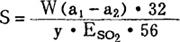 释义 | 硫磺耗用量的计算 式中 S——硫磺耗用量(%对甜菜) W——硫漂汁(浆)量(%对甜菜) a1、a2——硫漂前、后糖汁(浆)碱度(CaO%) y——硫磺中含S量(%) ESO2——二氧化硫吸收率(%) |