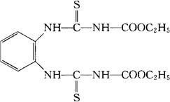 C14H18N4O4S2=370.44 CAS-23564-06-9 4,4′-邻-亚苯二双(3-硫代脲基甲酸乙酯)。 4,4′-o-Phenylenebis(ethyl 3-thioallophanate). 1,2-苯二双(亚氨基羰硫基)双氨基甲酸二乙酯。 1,2-Phenylenebis(iminocarbonothioyl)biscarbamic acid diethyl ester. 1,2-双(3-乙氧羰基-2-硫脲基)苯。 1,2-bis(3-Ethoxycarbonyl-2-thioureido)benzene. 杀霉菌药,杀真菌药,抗蠕虫药。 苯硫脲酯。 Thiophanate,Cercobin,Topsin,Nemafax. BAN,USAN,MI.  |