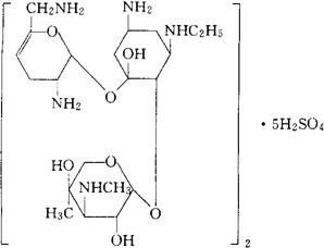 (C21H41N5O7)2·5H2SO4=1441.54 CAS-56391-57-2 O-3-脱氧-4-C-甲基-3-(甲氨基)-β-L-阿拉伯吡喃糖基(1→4)O[2,6二氨基-2,3,4,6四脱氧α-D甘油基-己-4-烯吡喃糖基-(1→6)]-2脱氧-N3-乙基-L链霉胺硫酸盐(2∶5)。 O-3-Deoxy-4-C-methyl-3-(methylamino)-β-L-arabinopyranosyl-(1→4)-O-[2,6-diamino-2,3,4,6-tetradeoxy-α-D-glycero-hex-4-enopyranosyl-(1→6)]-2-deoxy-N3-ethyl-L-streptamine sulfate(2∶5)(salt). 抗生素类药。 硫酸奈替米星,硫酸乙基西梭霉素。 Netilmicin Sulfate,Netroycin,Sch 20569. USAN,USP.MI.