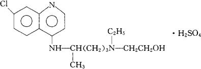 C18H26ClN3O·H2SO4=434.0 CAS-747-36-4 2-[[4-[(7-氯-4-喹啉基)氨基]戊基]乙基氨基]乙醇,硫酸盐(1∶1)。 2-[[4-[(7-Chloro-4-quinolinyl)amino]pentyl]ethyl amino]ethanol sulfate(1∶1)(salt). 7-氯-4-[4-[N-(羟乙基)乙氨基]-甲基丁基氨基]喹啉硫酸盐(1∶1)。 7-Chloro-4-[4-[N-(hydroxyethyl)ethylamino]-1-methylbutylamino]quinoline sulfate(1∶1). 抗疟药。用于治疗红斑疮和风湿性关节炎。 Hydroxychloroquine Sulfate,Plaquenil Sulfate,Ercoquin. TNN(Hydroxychloroquine),BP,USAN,USP,MI.  |