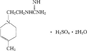 C9H18N4·H2SO4·2H2O=316.37 CAS-23389-32-4 CAS-1562-71-6(anhydrous) CAS-1463-28-1(guanacline) [2-(3,6-二氢-4-甲基-1(2H)-吡啶基)乙基]-胍硫酸(1∶1)二水合物。 [2-(3,6-Dihydro-4-methyl-1(2H)-pyridinyl)ethyl]guanidine,sulfate(1∶1)dihydrate. 1-(2-胍乙基)-1,2,3,6-四氢-4-甲基吡啶硫酸盐(1∶1)二水合物。 1-(2-Guanidinoethyl)-1,2,3,6-tetrahydro-4-picoline sulfatc(1∶1)dihydrate. 抗高血压药。 Guanacline Sulfate,B 1464,Leron,Linugon,Liron. INN & BAN(Guanacline),USAN.  |