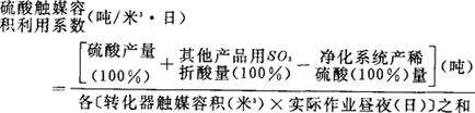 指化工企业用接触法制造硫酸的生产过程中,二氧化硫气体在硫酸转化器(接触塔)内催化氧化成三氧化硫的效率,以硫酸转化器内的触媒在一昼夜内每立方米生产硫酸的数量来表示。 其计算公式如下:  式中,每吨三氧化硫(SO3)(100%)折硫酸(100%)1.225吨。净化系统产稀酸因未经过触媒转化,故不计入触媒利用系数。 硫酸产量中不应包括:在企业自用硫酸过程中再回收的硫酸;在生产过程中同时生产的中间产品如二氧化硫、三氧化硫,不论气体或液体,均不能折成硫酸。 硫酸触媒容积利用系数愈大,表明单位时间和单位触媒容积的利用程度愈好,技术操作水平愈高。 |