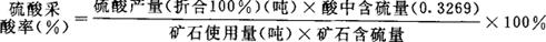 释义 | 硫酸采酸率 指反映化工企业硫酸生产过程中对硫铁矿中硫的利用程度的指标。 其计算公式如下: 式中,0.3269是指每单位硫酸(100%)的理论含硫量。硫酸产量中不应包括:在企业自用硫酸过程中再回收的硫酸;在生产过程中同时生产的中间产品,如二氧化硫、三氧化硫,不论气体或液体,均不能折成硫酸。 硫酸采酸率愈大,表明硫酸生产过程中对硫铁矿中硫的利用程度愈好。 |