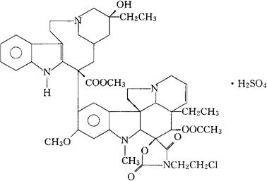C48H58ClN5O9·H2SO4=982.54 CAS-67699-41-6 (3R,5S,7R,9S)-9-[3′-(2-氯乙基)-6,7-二去氢-4β-羟-16-甲氧-1-甲基2′,4′-二氧代-2β,3β,5α,12β,19α-螺[白坚木次碱-3,5′-噁唑烷]-15-基]-5-乙基-1,4,5,6,7,8,9,10-八氢-5-羟-2H-3,7-甲撑氮杂环十-烯并[5,4-b]吲哚-9-羧酸甲酯4′-乙酸酯硫酸盐(1∶1)。 Methyl(3R,5S,7R,9S)-9-[3′-(2-chloroethyl)-6,7-didehydro-4β-hydroxy-16-methoxy-1-methyl-2′,4′-dioxo-2β,3β,5α,12β,19α-spiro[aspidospermidine-3,5′-oxazlidin]-15-yl]-5-ethyl-1,4,5,6,7,8,9,10-octahydro-5-hydroxy-2H-3,7-methanoazacycloundecino[5,4-b]indole-9-carboxylate4′-acetate(ester)sulfate(1∶1)(salt). 抗肿瘤药。 Vinzolidine Sulfate,LY104208. USAN.  |