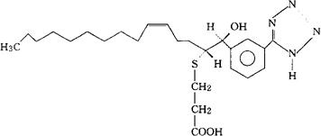 C25H36N4O3S=472.65 CAS-98116-53-1 [R-[R*,S*-(E,Z)]]-33-[[1-[羟基[3-(1H-四唑-5-基)苯基-]甲基]2,4-十四碳二烯基]硫代]丙酸。 [R-[R*,S*-(E,Z)]]-3-[[1-[Hydroxy[3-(1H-tetrazol-5-yl)phenyl]methyl]2,4-tetradecadienyl]thio]propanoic acid. 3-[[(1R,2E,4Z)-1-[(αS)-α-羟基-间-1H-四唑-5-基苄基]-2,4-十四碳二烯基]硫代]丙酸。 3-[[(1R,2E,4Z)-1-[(αS)-α-Hydroxy-m-1H-tetrazol-5-ylbenzyl]-2,4-tetradecadienyl]thio]propionic acid. 抗过敏药。 Sulukast,LY170680. INN,USAN.