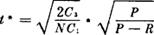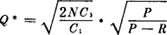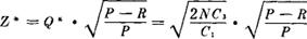 均匀进货,不允许缺货的存贮模型。 (1)模型假设条件: 模型Ⅰ条件中,第2条改为非瞬时进货,即边进货边使用,进货速度为P,且P>R。其余条件与模型Ⅰ相同。 (2)库存量随时间变化的图形:  (3)费用模型: ❶ 费用(C)与进货周期(t)关系:  ❷ 费用(C)与批量(Q)关系:  式中:N表示一定时期(一般指一年)对某种物资的需求总量;其余含义同模型Ⅰ。 (4)模型最佳量的确定: ❶ 最佳订购(或生产)批量:  ❷ 最佳进货周期(或生产间隔周期):  ❸ 最低费用  ❹ 最佳最高库存量  例:设某种物资按确定型模型Ⅱ周转,已知:P=30件/天,R=10件/天,N=3600件/天,其他数据同模型Ⅰ例。则  如果考虑购入成本,则最低总成本为: