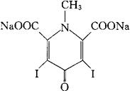 C8H3I2NNa2O5=492.92 CAS-519-26-6 1,4-二氢-3,5-二碘-1-甲基-4-氧代-2,6-吡啶二羧酸二钠盐。 1,4-Dihydro-3,5-diiodo-1-methyl-4-oxo-2,6-pyridinedicarboxylic acid disodium salt. 诊断用药。用于静脉尿道造影及心血管造影。 碘吡酸钠,甲碘吡酮酸钠。 Iodoxyl,Sodium Iodomethamate,Iodomethamate Sodium,Uropac,Pyelectan. NF,USAN,MI.
